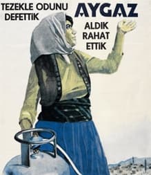 Tüp[!] belliğinin tanıtımında tercih edilen kadın görselinin ise diğer tanıtımların aksine çekicilikten uzak, süsten arındırılmış; yazmasıyla, yeleğiyle halktan seçildiğini görüyoruz. Tüp bellikleri özellikle halka hitap etmesi gereken belliklerdir. Isınma ihtiyacı halktan insanların gündeminde yer alan maddi bir sorundur. Yüksek gelirli insanların ısınma ihtiyacı gündem olmaz, halletmeleri kolaydır. Tanıtım görselinde kullanılan kadın imgesi ile bellik ve toplum arasındaki ilişkinin samimiyetinin hissedilmesi amaçlanmıştır. Görseldeki yazmalı Anadolu[!] kadınını seçkin bir giyim belliğinin tanıtımında göremezdik.