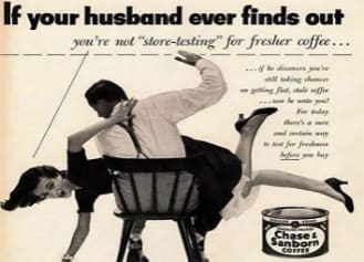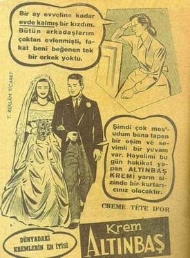 Bir diğer görselden aile içindeki düzeni anlayabiliyoruz. Para kazanan bir erkek ve evde çocuğuna bakan bir kadın. Henüz 90’lar tanıtımlarında çalışan bir kadın imgesine rastlamadım. Diğer görselde ise eve para getirmediği için kocasına kapı açmayan bir kadın görüyoruz. Tabi, kadın güzel yemek yapmadığı için eve gitmek istemeyen bir erkeğin tanıtımını yapan zihniyet, eve para getiremediği için eve giremeyen bir erkeğin tanıtımını da yapar. Bu da erkeklere yapılan şiddetin, baskının bir göstergesidir. Her gün herkesin karşısına çıkan tanıtımlarda aile yapısını, insan ilişkilerini bu şekilde göstermek toplumu geriye götürmekten başka bir şey yapmayacaktır ki geçmişte yapılan hataların günümüze nasıl sirayet ettiğini an be an yaşıyoruz ve deneyimliyoruz.