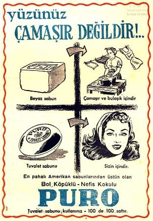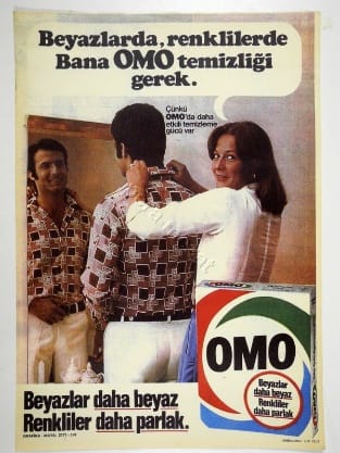 Temizlik tanıtımlarında çokça tercih edilen kadın imgesi, temizlik işlerinin toplumda kadına ait bir iş olduğunu hissettirmektedir. Yapılan işi kolay ve keyifli göstermeye çalışmak ürünün pazarlanması için önemli bir ayrıntıdır. Arıtıcı [deterjan] belliğinin tanıtımında, erkeğin yakasını düzelten bir kadın imgesi yer almaktadır. Kadın çok mutlu görünmektedir. Çamaşırlar temiz, kadın işini iyi yapmıştır. Adamın aynadaki yansımasından da anlayacağımız üzere temiz çamaşırlar, ütülü yakalar ile kadın kocasını çok memnun etmiştir. Tek bir görselde toplumsal görevlerin dağılımını görmekteyiz. Tabi ki aile içerisinde böyle bir görev dağılımı olabilir. Az önce de söylediğim gibi eve para getiren erkek, ev işlerini yapan kadın, birlikte yetiştirdikleri çocuklar. Önemli olan toplumsal ve bireysel dayatmalar olmadan kişinin görev tanımlarını belirlemesi ve aile içinde huzurun sağlanmasıdır.