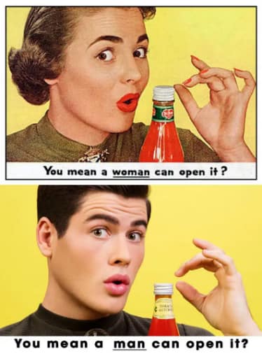 Tanıtımlarda dikkat çekmek ve ilgiyi artırmak için “kadın” görselleri daha fazla tercih edilmektedir. Verdiğim örnek görsellerde görebileceğiniz gibi kadınlar her zaman çekici, bakımlı ve arzulayıcı görünmektedirler. Hâlbuki bir makarna tanıtımında görmemiz gereken şey çekici bir kadın değildir! Bir diğer görselde ise şu cümleyi görmekteyiz: “Ne koltuklama [kompliman] ne tatlı dil ne iltifat bu kadını yola getiremedi. Hâlbuki bütün bunları yapacağına ona yarım kilo[!] yeşil mercimek alsaydı mesele kalmazdı.” Sekiz aydır aşkını kabul ettirmeye çalışan bir erkeğe verilebilecek en güzel tavsiye! Bir kadını ne mutlu eder tabi ki çok güzel yaptığı bir yeşil mercimek yemeği!
